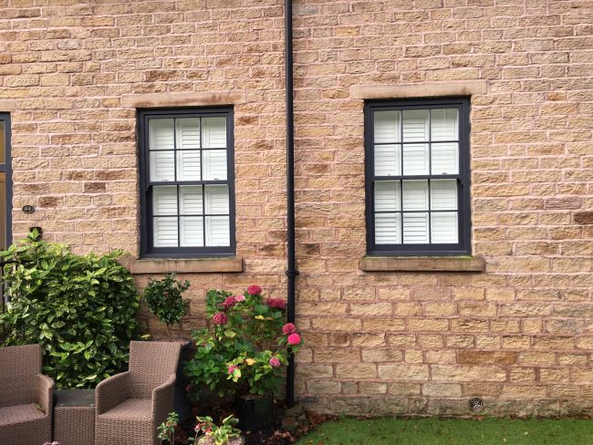 Hardwood shutter installation this week: Two flat sash windows fitted with white tier on tier shutters in Horwich, Bolton – ❤️ the look of these windows from the outside!