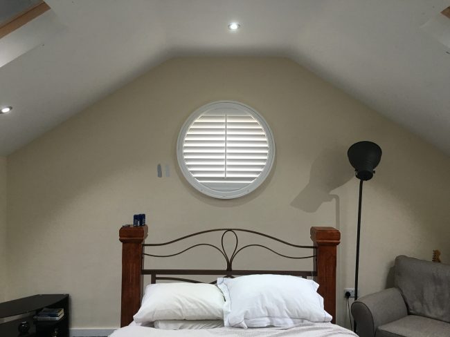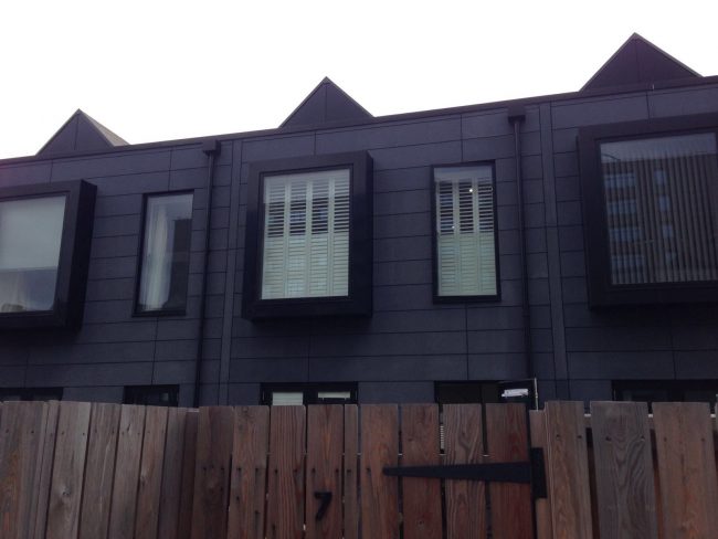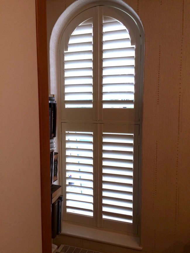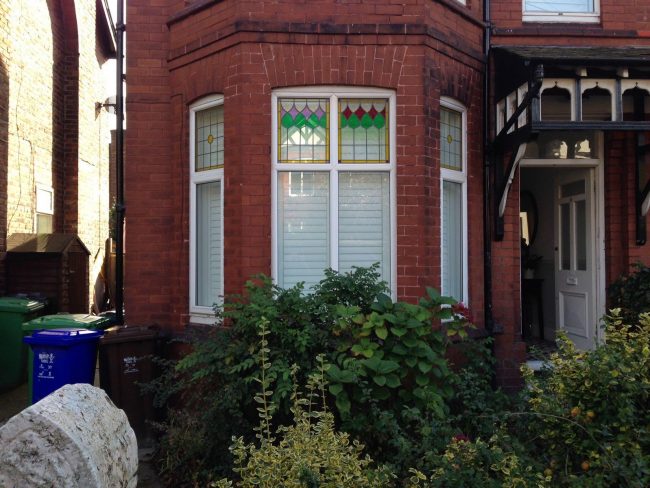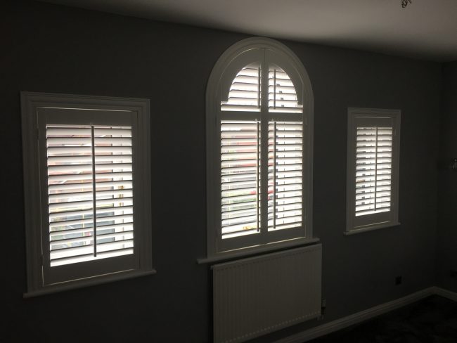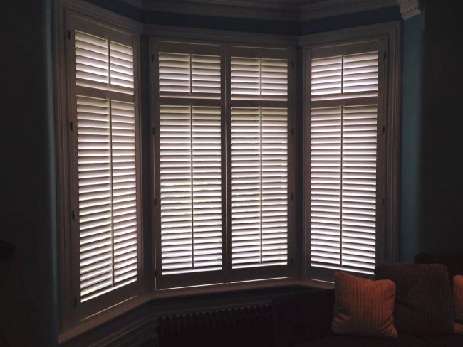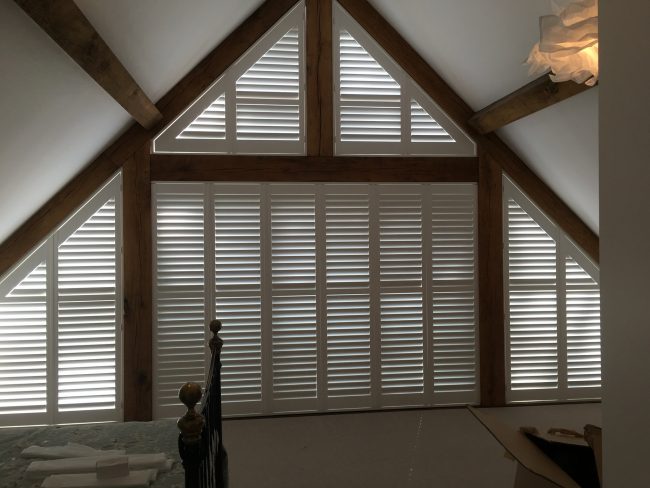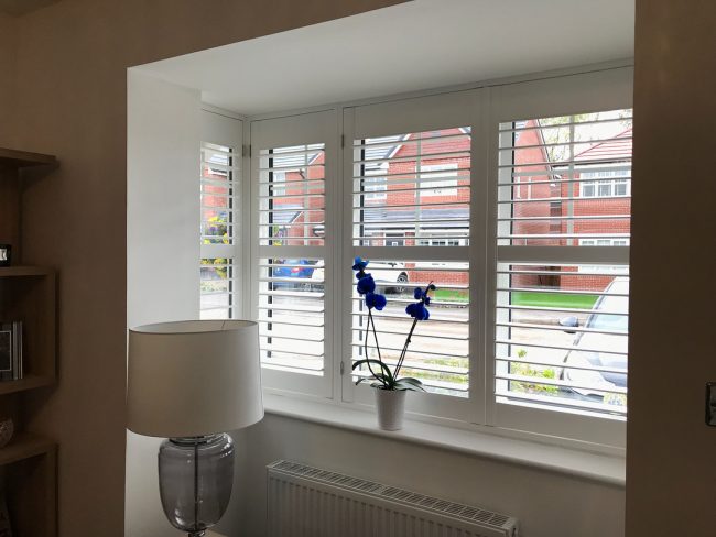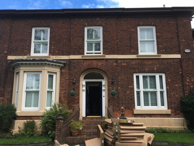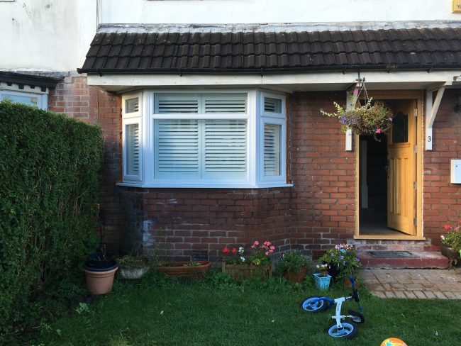 5 windows at the front of this house in Wilmslow fitted with wooden shutters this week – 1 flat window and 4 bay windows – with hidden pushrods & concealed splits in the louvers.