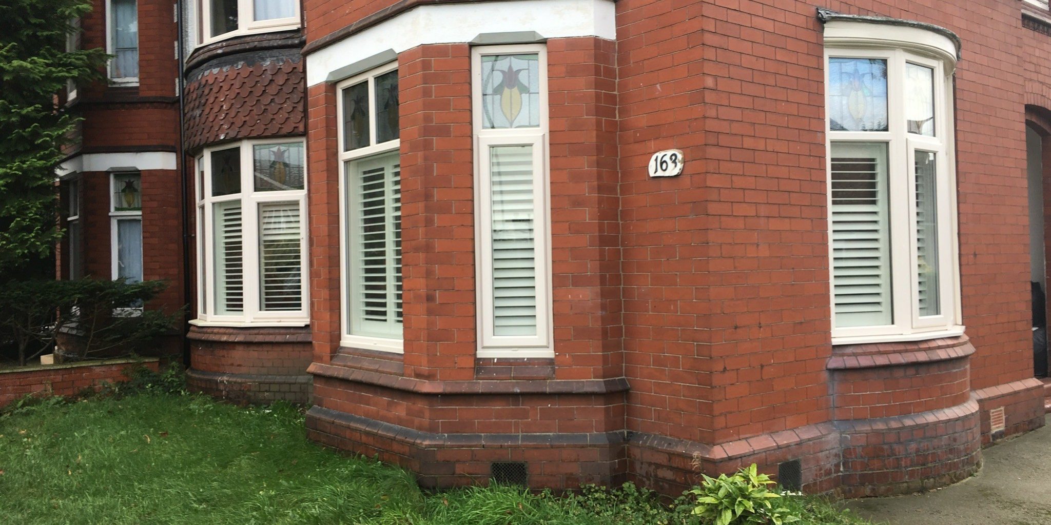 One of a few Café style shutter installs we have done recently, this was one 3 sided bay, one 4 pane curved bay and one small 3 pane curved bay window – in Trafford, Urmston.
