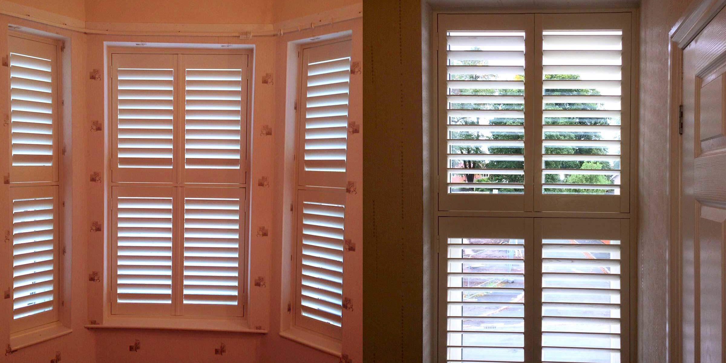 A recent installation in Altrincham – A 3 sided bay window spilt into 3 separate panels and a standard window, both fitted with white tier on tier plantation shutters. We only use 100% real hardwood for the entire shutters: the frame, the panels & the slats