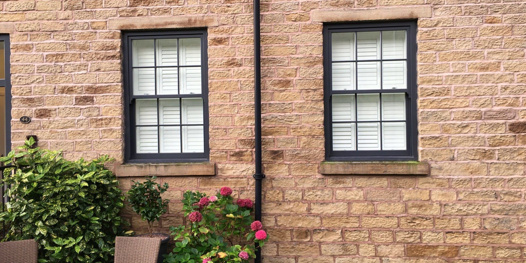 Hardwood shutter installation this week: Two flat sash windows fitted with white tier on tier shutters in Horwich, Bolton – β€οΈ the look of these windows from the outside!
