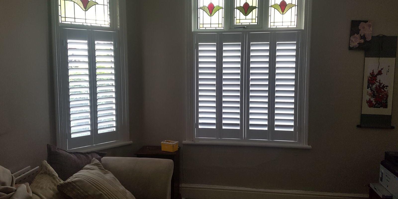 Café Style Shutters are the most popular choice for people with Stained Glass Windows